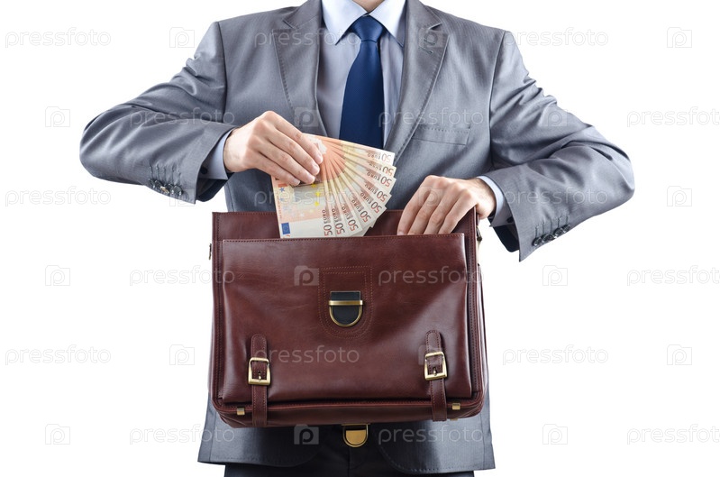 Мужчина кладет банкноты евро в портфель