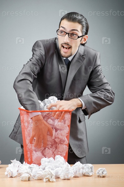 Мужчина с использованной бумагой в корзине