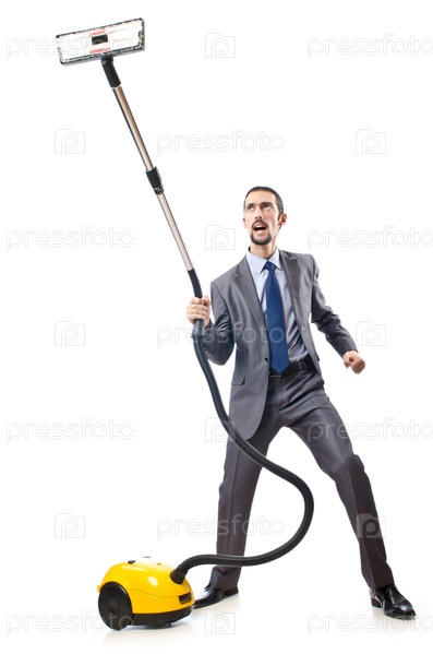 Бизнесмен с пылесосом на белом фоне