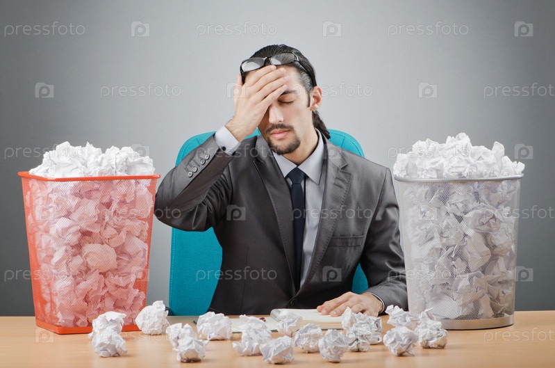 Человек с большим количеством мятой бумаги