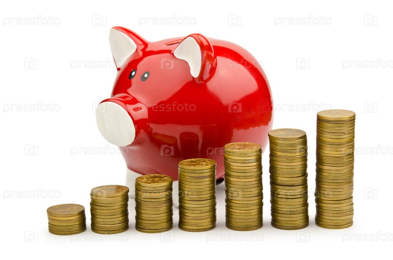 Копилка и монеты, изолированные на белом фоне