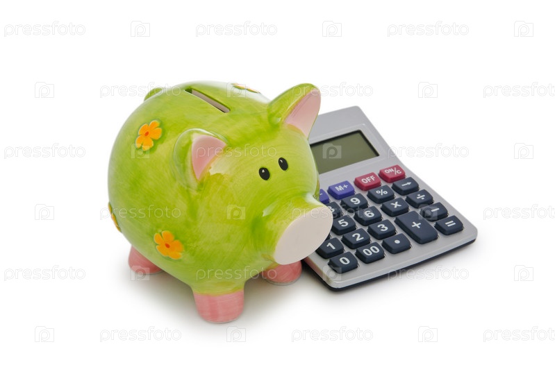 Калькулятор и копилка на белом фоне