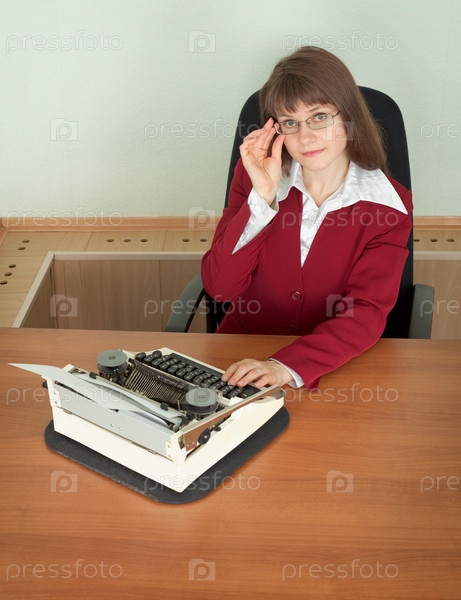 Девушка в офисе за столом работает на старой печатной машине