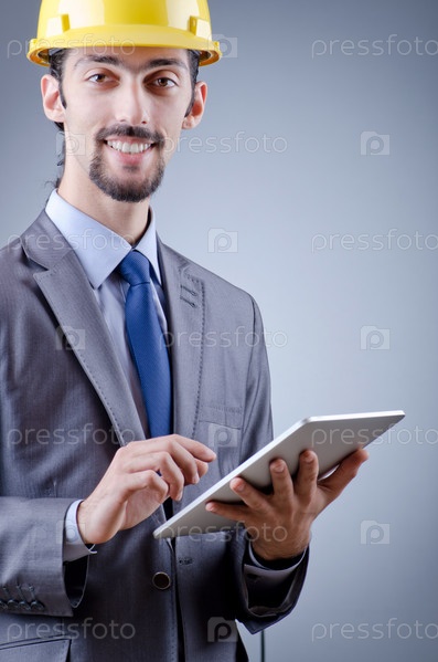 Строитель с планшетным компьютером