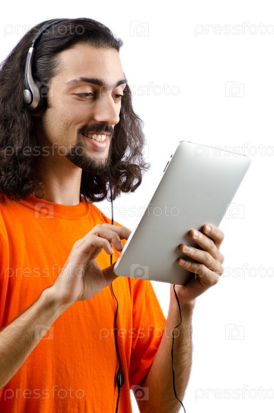 Молодой человек слушает музыку на планшетном компьютере
