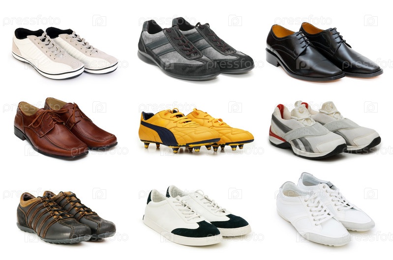 Девять пар обуви на белом фоне