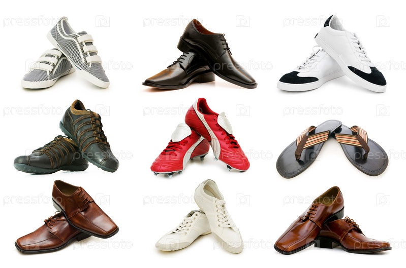 Девять пар обуви на белом фоне
