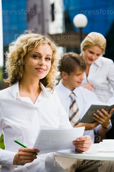 Молодая красивая улыбающаяся женщина держит бумажные работы и зеленую ручку на фоне двух бизнесменов и здания