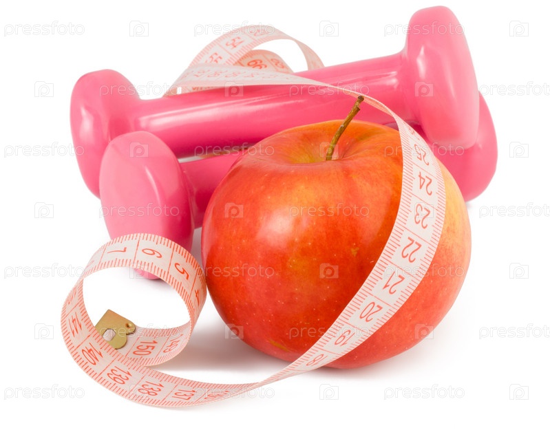 Два гантеля, красное яблоко и измерительная лента на белом фоне