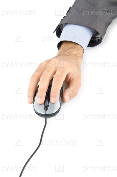 Рука бизнесмена с компьютерной мышью на белом фоне
