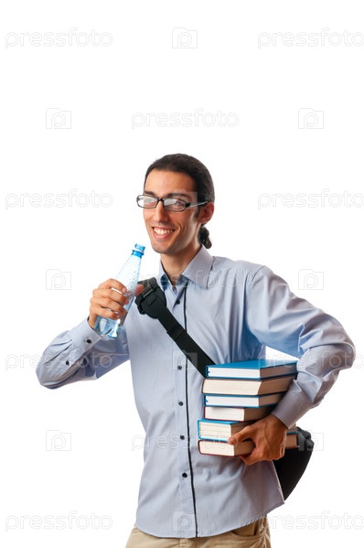 Студент с книгами на белом фоне