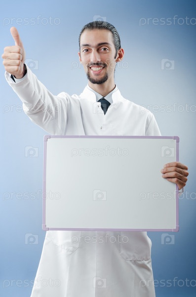 Доктор с пустой доской на голубом фоне