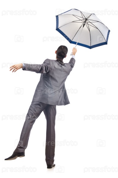 Бизнесмен с зонтиком стоит спиной на белом фоне