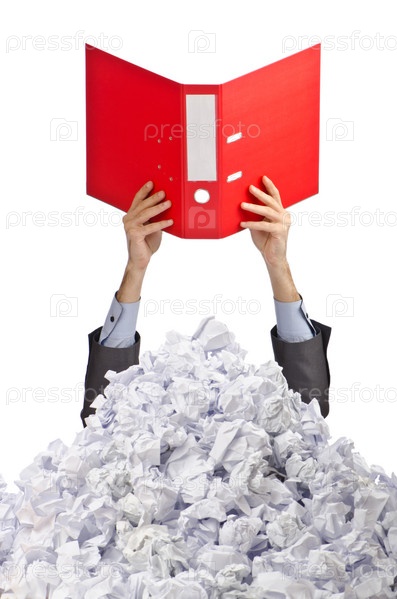 Руки бизнесмена с красной папкой торчат из-под кучи смятой бумаги