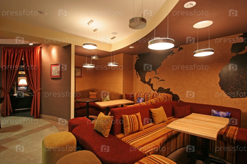 Интерьер современного кафе с мягкими диванами и подушками