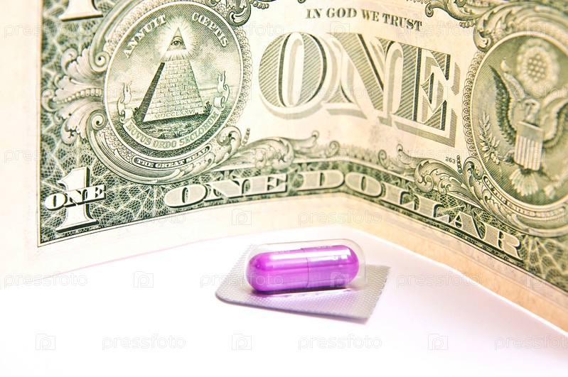 Одна красная таблетка с одним долларом, изолированным на белом