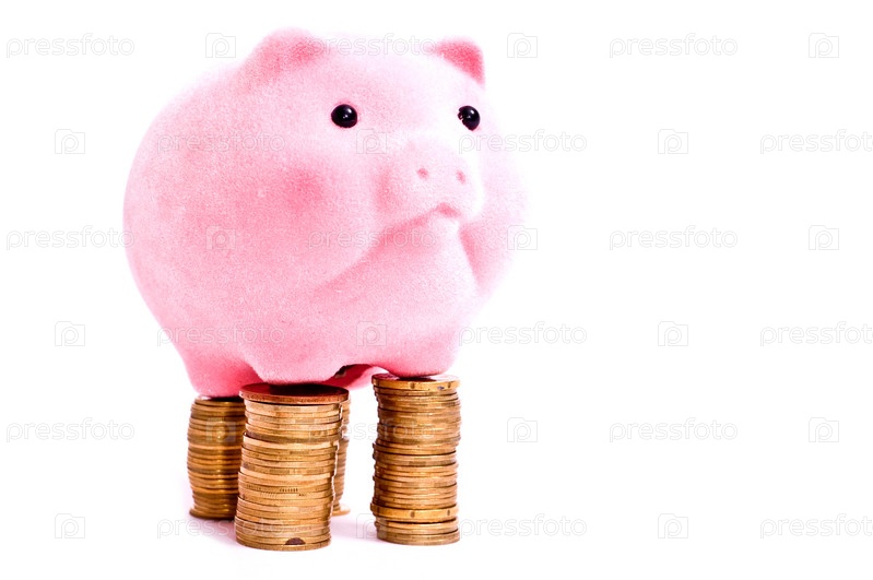 Столбики золотых монет рядом со свиньей-копилкой