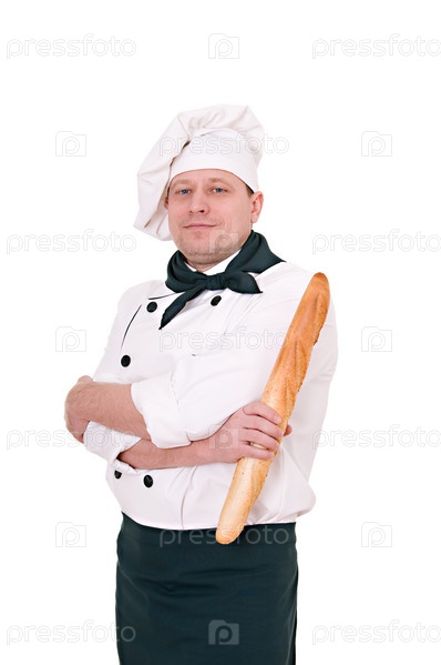 Шеф-повар с батоном, изолирован на белом фоне