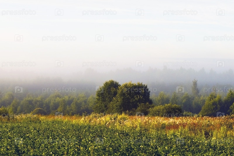 Поле и кустарник, укрытые утренним туманом, отступающим перед лучами яркого летнего солнца
