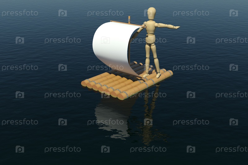 Деревянные человек плавает на плоту с белым парусом. Р