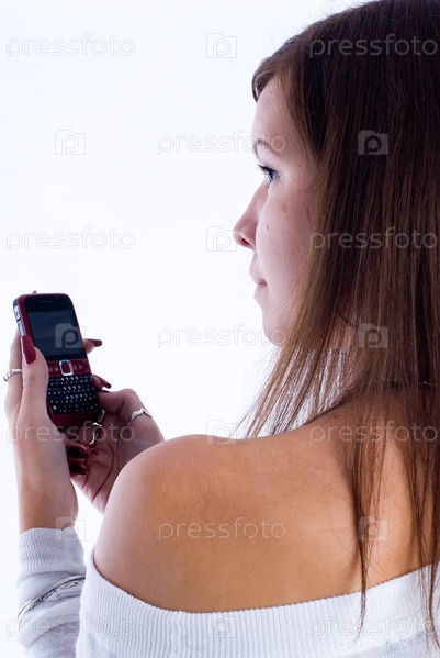 Девушка с телефоном, белый фон