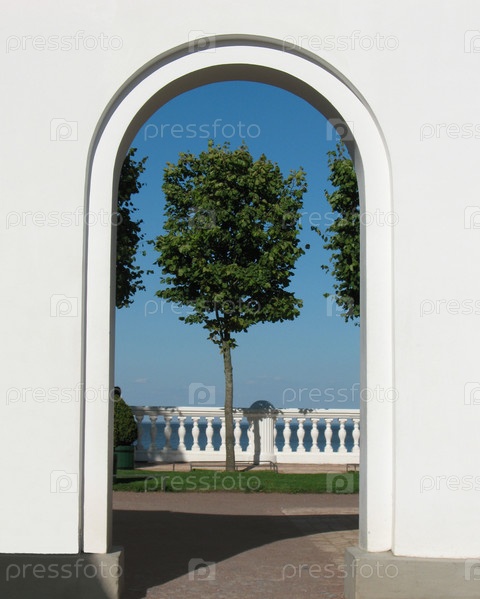 Вид сквозь арку на Морскую террасу перед дворцом "Монплезир", Петергоф