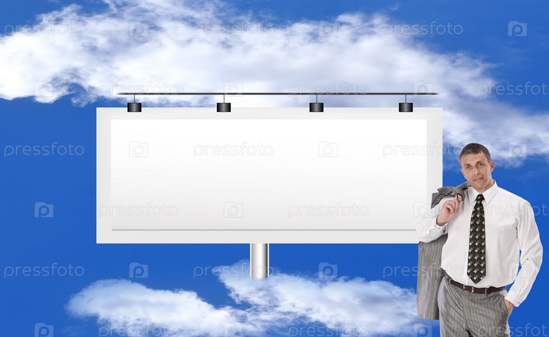 Успешный бизнесмен у рекламного щита на фоне голубого неба