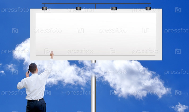 Бизнесмен с рекламным щитом на фоне голубого неба