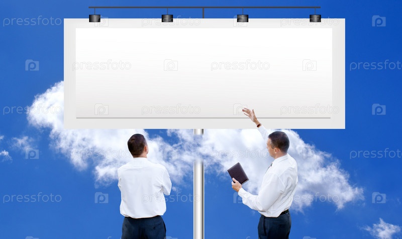 Успешные мужчины у рекламного щита на фоне яркого голубого облачного неба