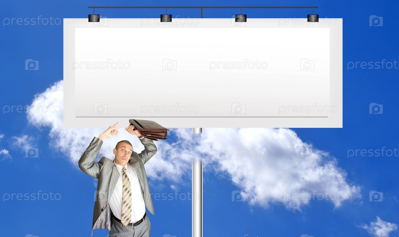 Испуганный бизнесмен около рекламного щита на фоне голубого неба