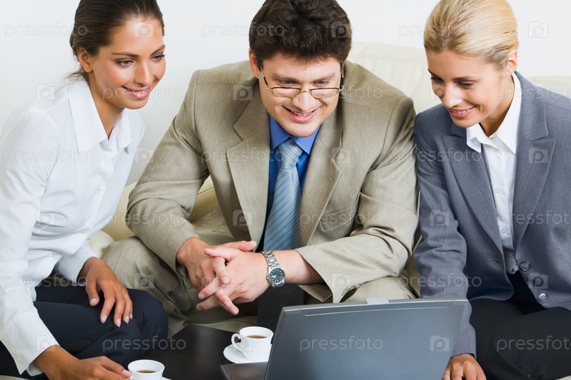 Портрет трех улыбающихся бизнесменов, сидящих на диване и смотрящих в ноутбук
