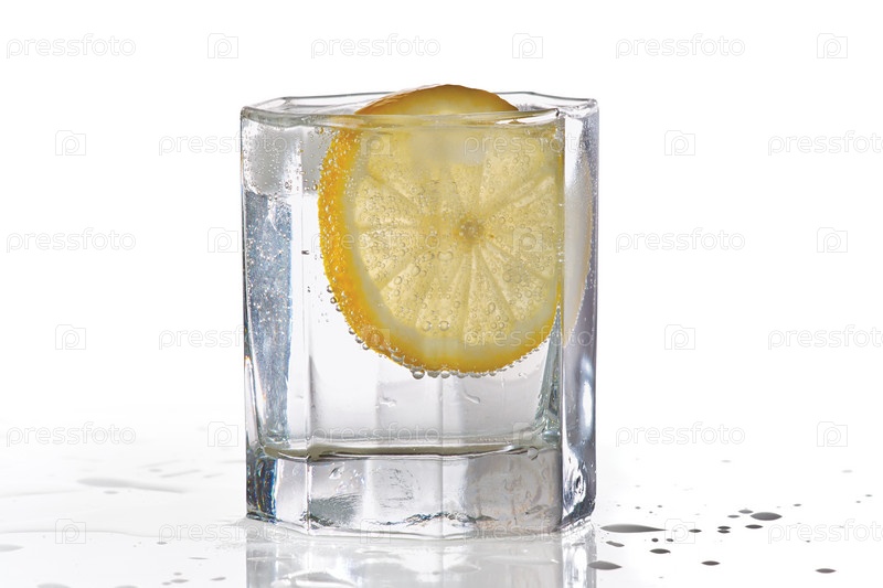 Стакан воды со льдом и лимоном, белый фон