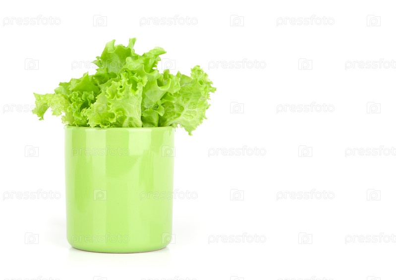 Листья салата в чашке на белом фоне