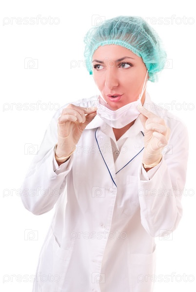 Удивленная женщина-врач, изолировано на белом фоне