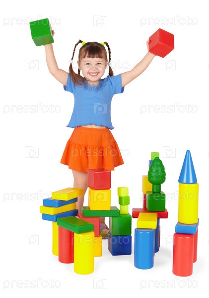 Девочка с игрушками на белом фоне