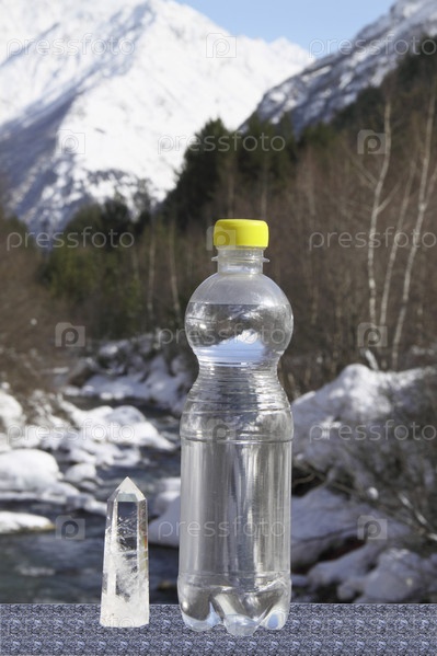 Бутылка чистой воды и кристалл на фоне гор