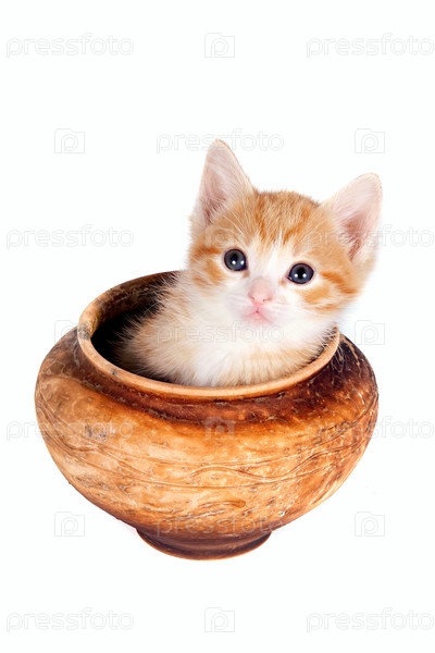Котенок в глиняном горшке на белом фоне