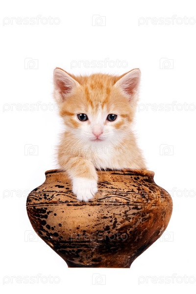 Котенок в глиняном горшке на белом фоне