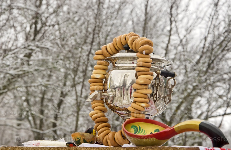 Самовар с бубликами в зимнем лесу на Масленицу