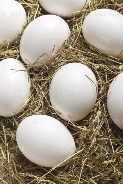 Свежие куриные яйца в соломенном гнезде