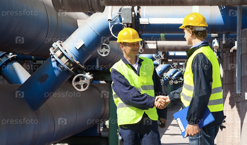 Два инженера в касках и жилетах безопасности на объекте