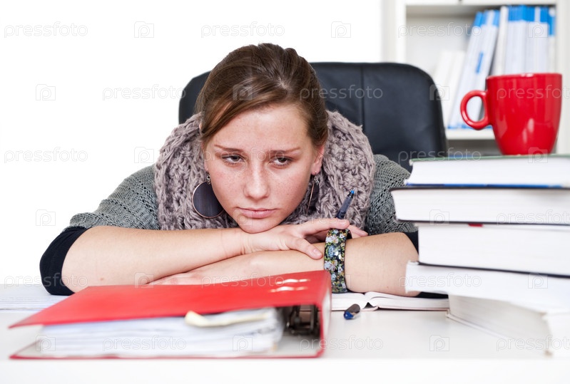 Уставшая молодая женщина с книгами на столе
