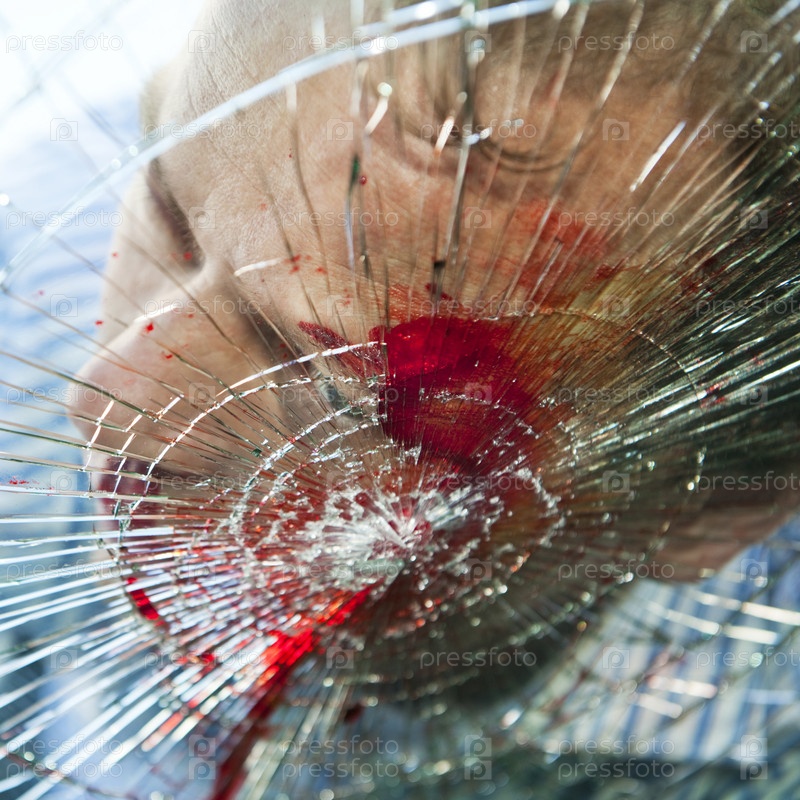 Сбитый пешеход на окровавленном ветровом стекле автомобиля