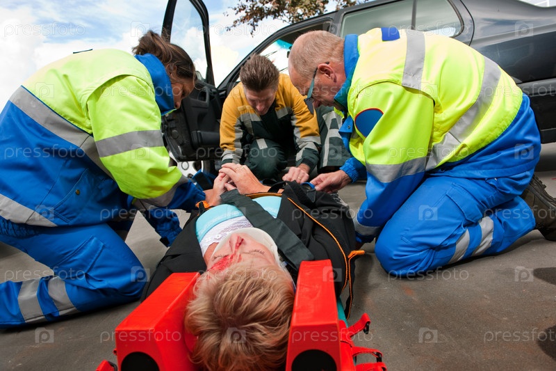 Врачи скорой помощи и пожарный оказывают помощь пострадавшему в аварии человеку