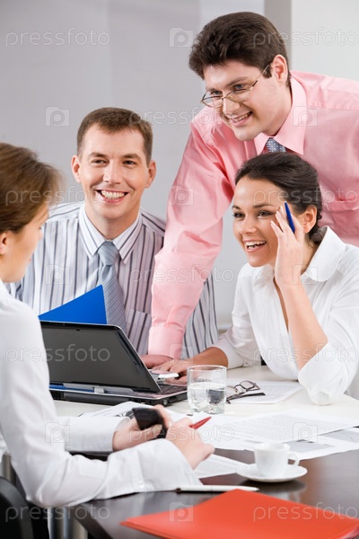 Деловые люди слушают сотрудницу в офисе и улыбаются
