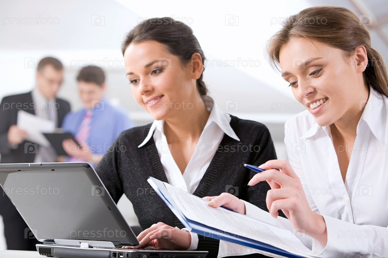 Девушки сидят перед ноутбуком на фоне деловых мужчин