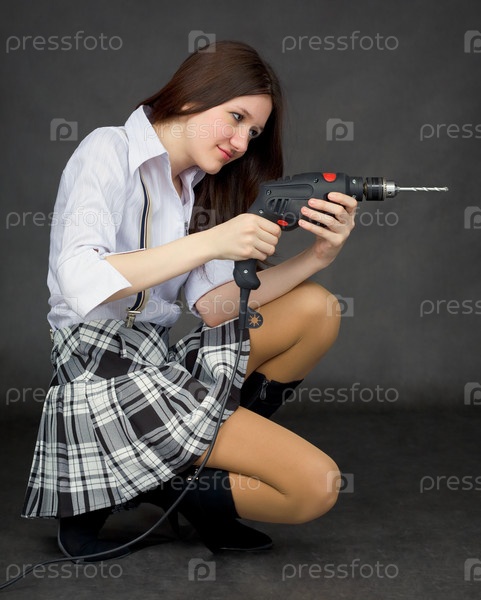 Молодая красивая девушка в юбке учится сверлять на электрическом дреле