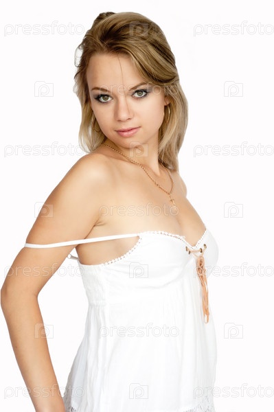 Девушка позирует в студии на белом фоне