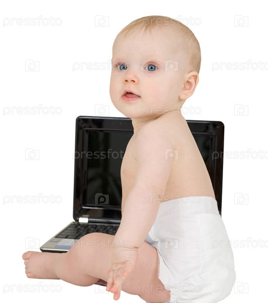 Ребенок сидит на белом фоне с ноутбуком