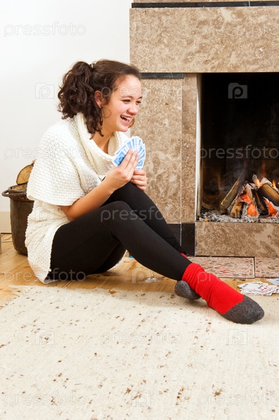 Молодая женщина наслаждается игрой в карты с теплом камина